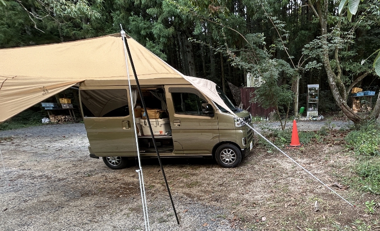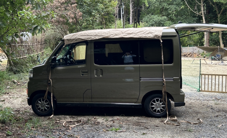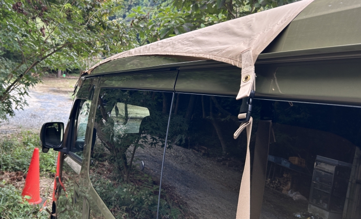 そうすると当然突然の雨や夜露対策としてカーサイドタープが必須。
