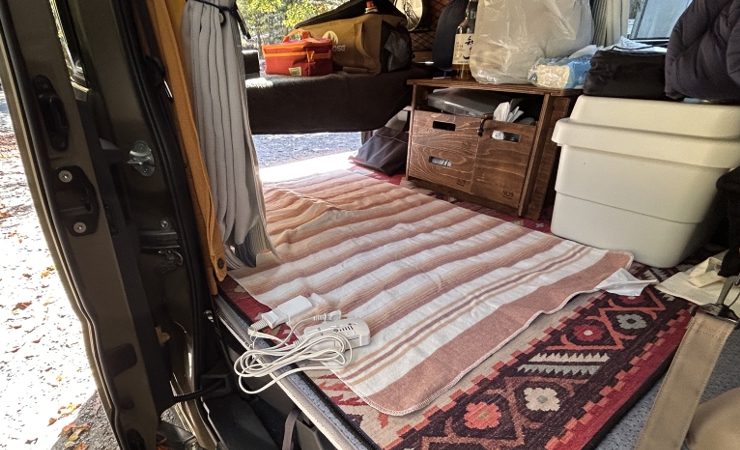 夜は冷え込みが予想されるので、ラグの上に電気敷毛布を敷き、その上にシュラフを広げます。