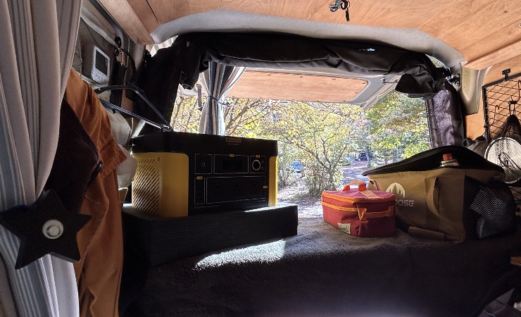容量1,000KWのポータブル電源をリアボードに置いてここから給電。