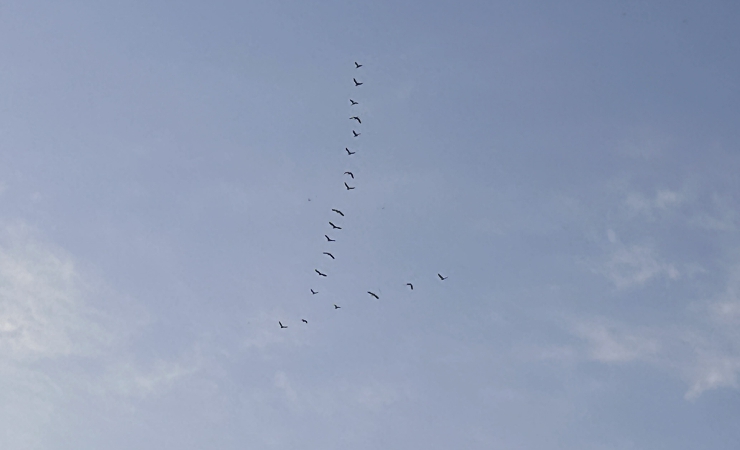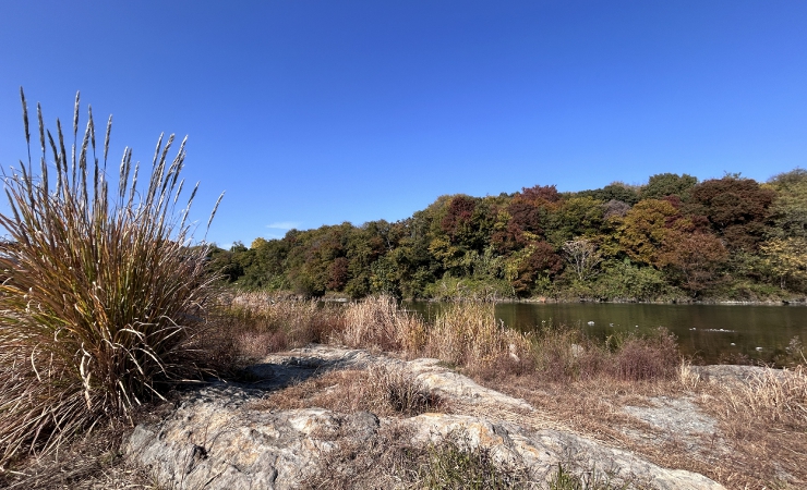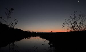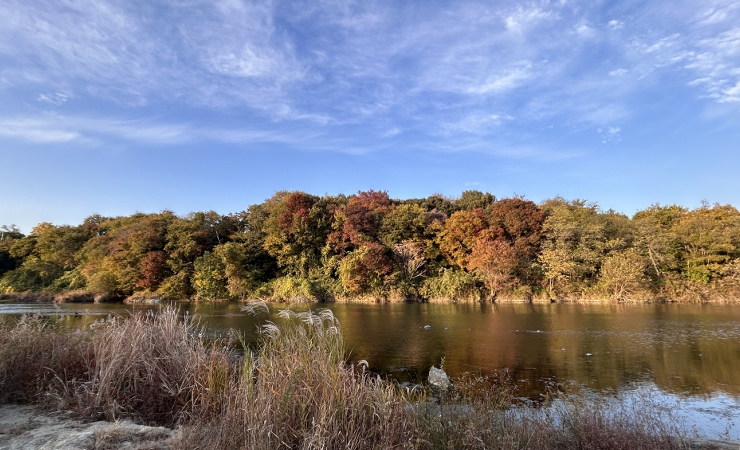 日が傾き、川向うの森がオレンジ色を帯びてきました。