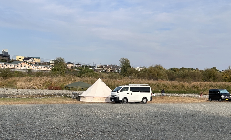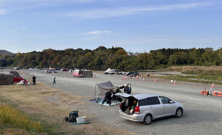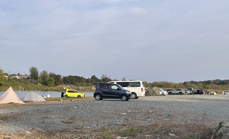 料金所の近くは多くのキャンパーが陣取っていたので、私は河原の奥の空いたスペースに車を入れました。