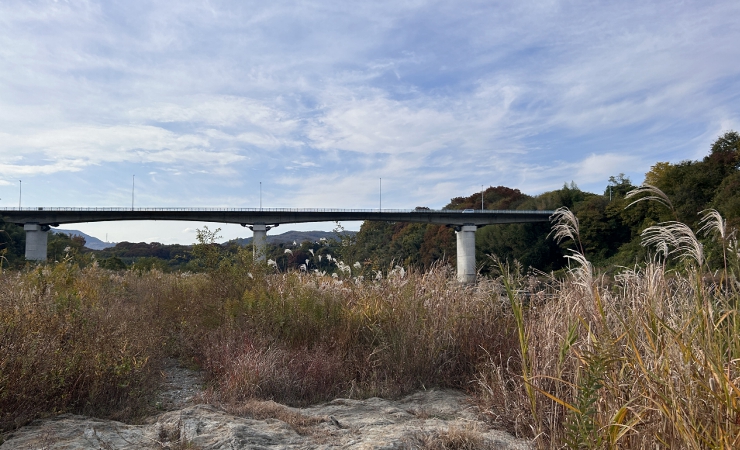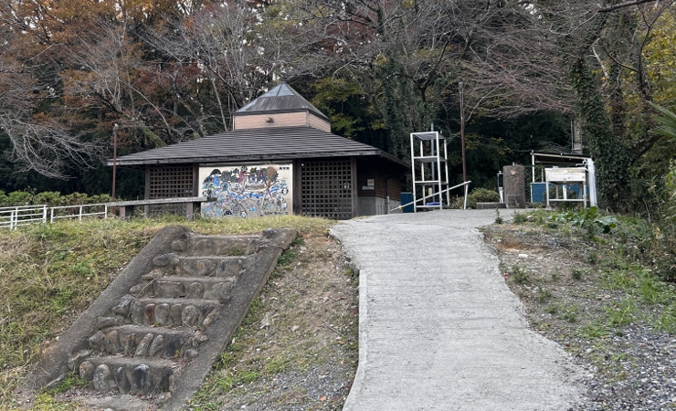 トイレは河原から料金所の横を通り、正面の道路を横断したところにあります。
