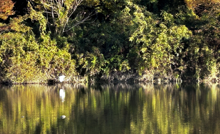 朝マヅメの時間帯で風もなく、写真では見難いですが川面はまるで鏡のように風景を映しています。