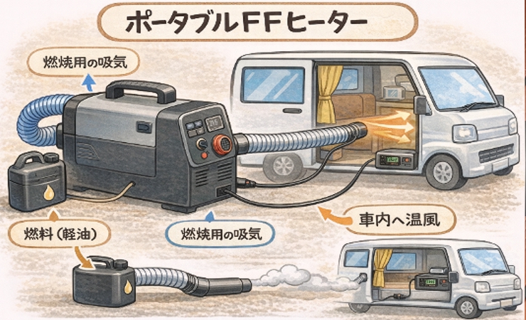 ポータブルFFヒーターとは、車に固定工事をせずに使える、持ち運び可能なFFヒーターです。