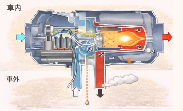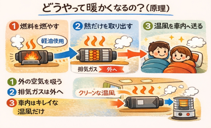ガソリンや軽油を燃やして温風を送るヒーターでありながら、燃焼ガスが車内に入らないので安全性が高い暖房器具です。