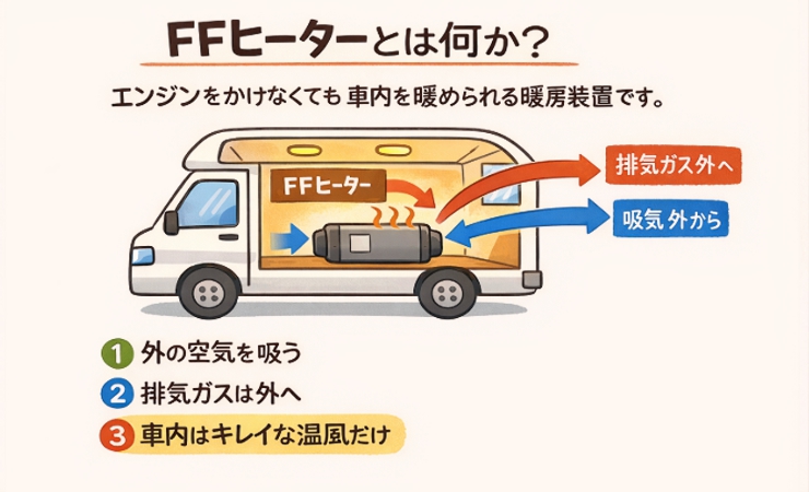 FFヒーターとは、車のエンジンをかけなくても車内を暖められる暖房装置です。