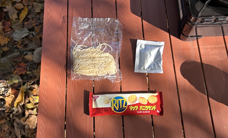 ランチはスーパーで見つけた「5食入り100円」という謎の値段の醤油ラーメンとリッツバニラサンド。