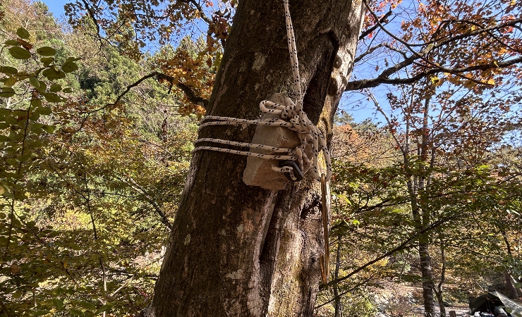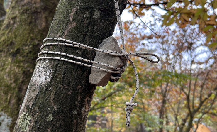 ただノーススター用シェードを忘れてきたのでそのまま吊るすとランタン本体と木の幹が接触し木を傷めてしまうので、フックと木の幹の間に石を挟んでスペースを作ります。
