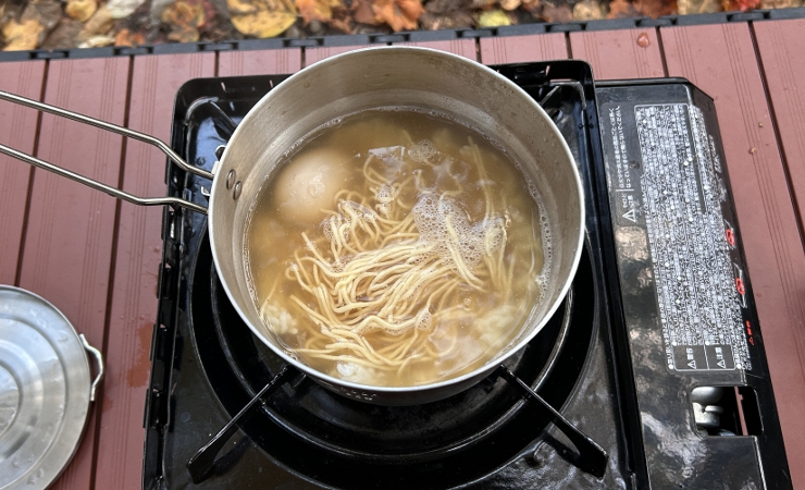 昨夜ひらめいたとおり、おでんにご飯を入れ、おまけに昨日の昼食べるのを忘れていたラーメンの麺もぶち込んで煮込みます。