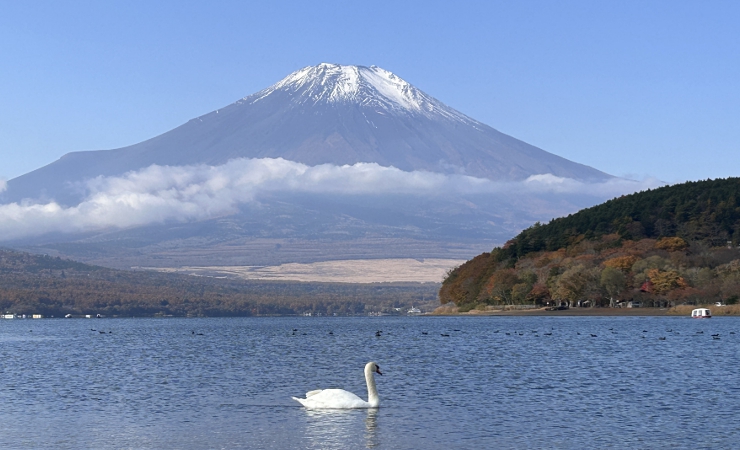 白鳥の後ろは富士山。