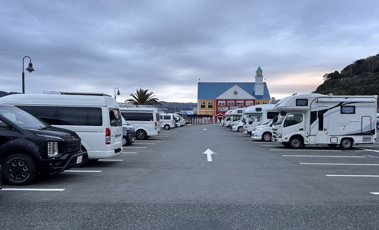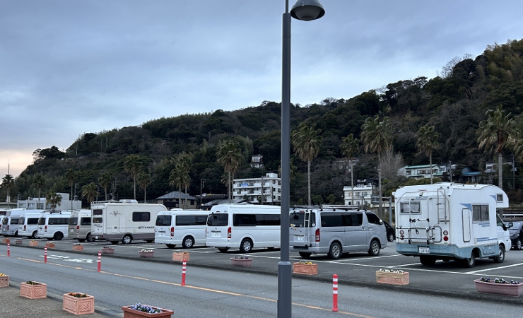 目覚めて車から出ると駐車場にはおびただしい数のキャンピングカー&キャンパー仕様のVANが停まっていました。